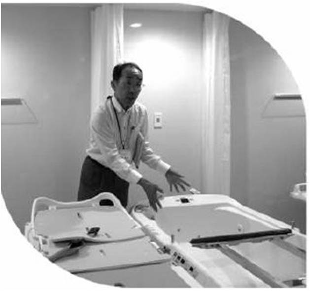 图为日本静冈县一家养老院的工作人员向记者演示给瘫痪老人洗澡的设施。记者田泓摄。