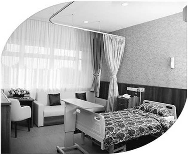 护理型住所区的老人根据护理级别入住相应楼层。一楼大厅设有护工总监 控中心,每个楼层还设有分值班室。每名护工的看护范围被严格划分,责任到人。房型分为双人房和单人房,分别设有独立洗浴卫生间,每个楼层还设有公共会客室与活动室。