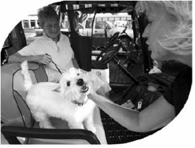图为“太阳城”内,相识的两位老人在高尔夫球车里逗狗。